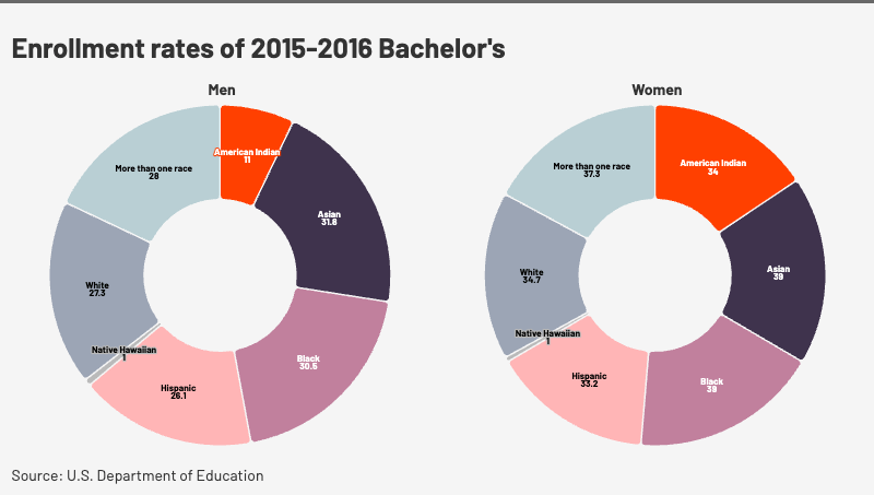 When examining the breakdown by racial group of individuals 18-24 enrolled in college, White men dropped 40% from a previous 49%, Black men from 42% to 37%, and Hispanic men 42% to 33%.